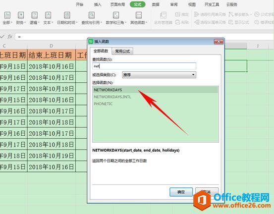 弹出对话框,在查找函数中查找出NETWORKDAYS函数,单击确定。