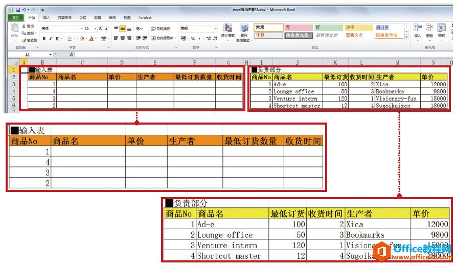 上述例子中,A1到 D1项目名称分别为“商品名”、“单价”、“生产者”、“最低订购单位”,这些项目在 F1到 I1的范围中位于左数第几列,会相应地显示在 A2到 D2中。以单元格 A2为例,“A1(即商品名)的值,在 F1:I1范围里位于左数第2个”,那么 A2中则会显示数字2。