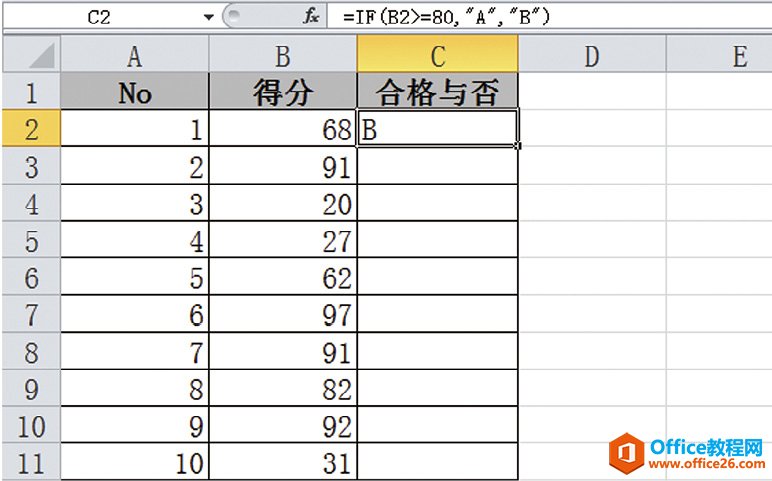 也就是说,之前列出的公式,其实是一个命令句“B2的值大于等于80输入 A,不是则输入 B!”