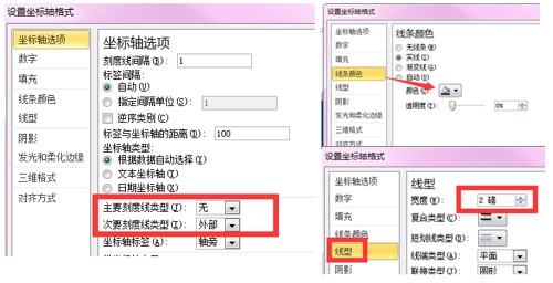 8. 选中横坐标轴,右键-【设置坐标轴格式】-【坐标轴选项】-主要刻度类型-无,次要刻度类型-外部。【线条颜色】-灰色,线型-2磅。