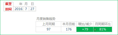 在“上月同期”对应的E6单元格中,我们输入: =SUMPRODUCT((M2:M100=销售!B2)*(N2:N100=C2-1)*(O2:O100<=D2)*(L2:L100)) 其中:“(M2:M100=销售!B2)” 是指年份为2016年;“(N2:N100=C2-1)”当前月为7月,所以要减去1,即6月;“(O2:O100<=D2)”则是指选择小于当前所在月第几天,表中是07.27日,所以实际上是选择小于27的天数;“(L2:L100)”是指要计算的订单数据。 同样,在“本月同期”对应的F6单元格中,我们输入: =SUMPRODUCT((M2:M100=销售!B2)*(N2:N100=C2)*(O2:O100<=D2)*(L2:L100)) 同理,只是月份要选择当前月,即(N2:N100=C2) STEP4 编写对比结果公式: 月度同期的数据出来了,接着就是对比结果了,我们通过采用“+/-”、醒目颜色、单元格底纹颜色等条件格式的设置,直观表现数据的变化: 在“增加/减少”对应的G6单元格中,我们输入: =IF(F6-E6<0,F6-E6,"+"&F6-E6) 这个公式的目的是在数字的前面有一个“+”,这样看起来更专业~