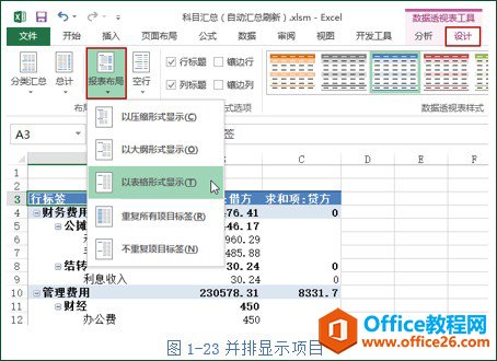 Step 08如图1-23所示,单击数据透视表任意单元格,在“设计”选型卡,单击“报表布局”,“以表格形式显示”。