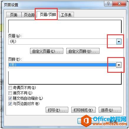 步骤2、此时弹出【页面设置】窗口,窗口中的【页眉/页脚】选项卡就是我们设置页眉和页脚的地方。点击页眉或页脚右侧的下拉按钮可以将页眉页脚设置成表格自带的页码,工作簿位置,工作簿名称,工作表名称或者制作人等等。
