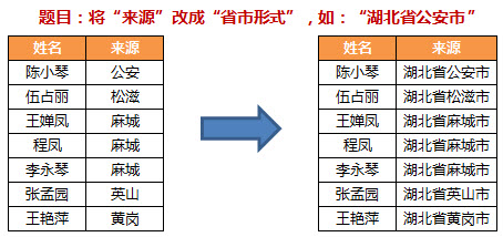 题目:将“来源”列的excel单元格文字,批量添加文字,格式为:湖北省××市。