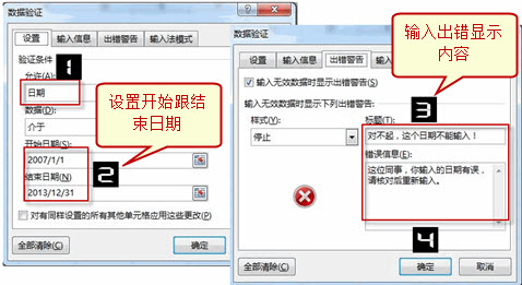 A:可以利用excel数据有效性来控制输入的日期规范。只要输入不正确就让录入者重新输入。如图所示,在“允许”文本框选择日期,设置“开始日期”和“结束日期”,输入出错警告信息,点击“确定”按钮。