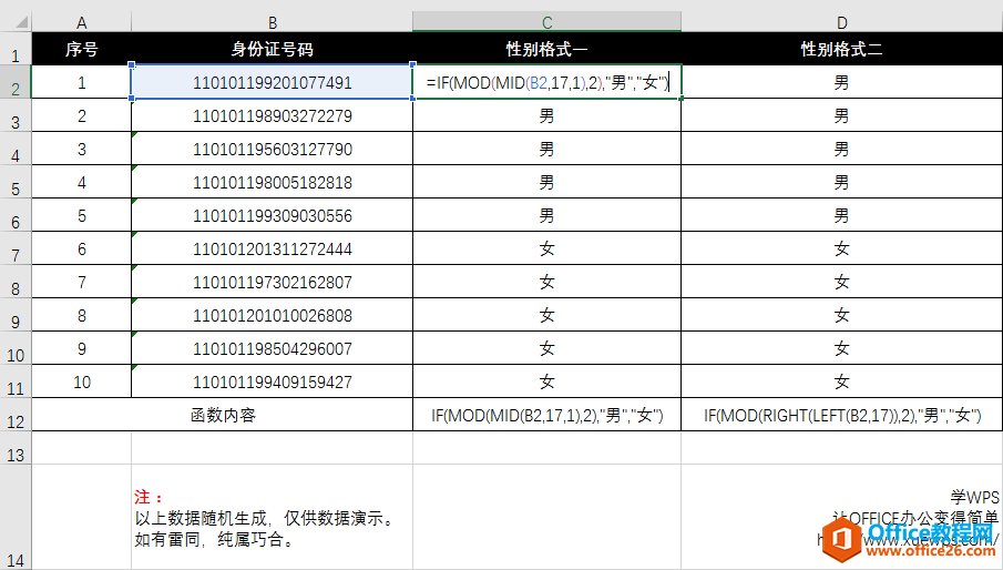 MOD:取上一步结果除以2的余数;IF:判断结果是奇数是男,否则是女;