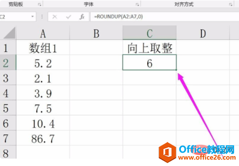 3、ROUNDUP函数需要输入两个参数,第一个是选择你要向上取谁的整,第二个则是保留几位小数。