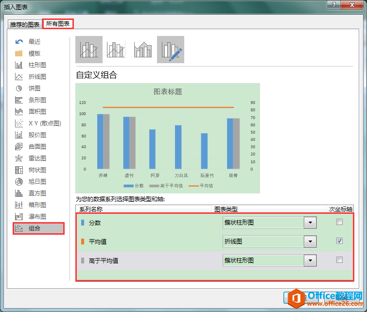 2、在[插入图表]对话框中,切换到[所有图表]选项卡,单击左侧列表最下面的[组合],在右侧将系列"分数"的图表类型设为"簇状柱形图";将系列"平均值"的图表类型设为"折线图"(同时勾选"次坐标轴"选框);将系列"高于平均值"的图表类型设为"簇状柱形图",最后单击[确定]按钮。
