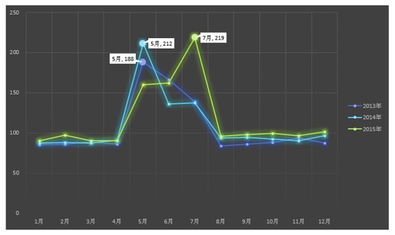 10. 将几个数据高点突出显示。单击两次选中2015年7月的数据点,右键-【设置数据点格式】-【标记】-【内置】,类型选圆形,大小设置为10,将为该数据点右键-【添加数据标签】-【添加数据标】。同理设置2014年5月以及2013年5月的数据高点。如下图所示:
