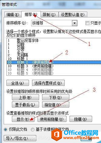 3、点击“推荐”选项卡,再选择要显示的标题,然后点击“显示”。然后按照需要,分别把“标题3”“标题4”等显示。最后点确定即可。