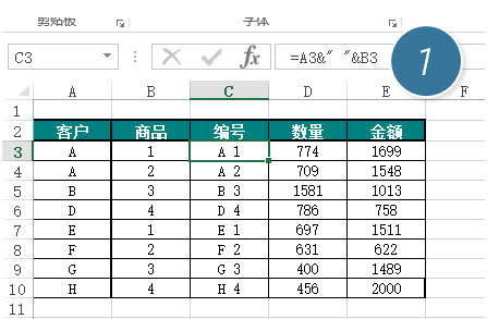 利用透视表之前,先把处理一下Sheet1和Sheet2的数据结构。在商品和数量之间插入一个列”编号“。然后利用&符号把“客户“和”商品“的数据连接起来。记得中间链接一个空格,用引号引起来。(下图 1 处)