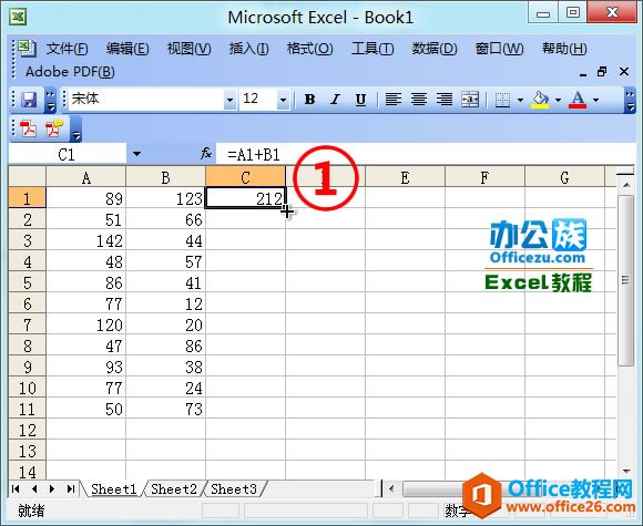 求出下图中,将A1和B1单元格中的总和结果显示在C1单元格中。