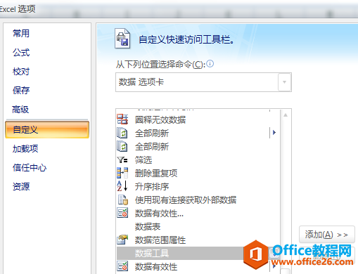 上图中,左边先选择“自定义”,中间那里选择“数据 选项卡”,最后在下面找到“数据工具”,接着再点击“添加”按钮将其添加到右边,这样,就行了。