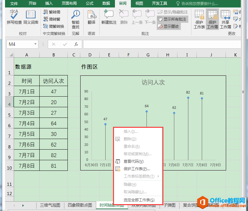 3、此时,工作簿结构已被锁定,右键单击工作簿中任一工作表标签,可见工作表"插入""删除""重命名""移动或复制"等命令均显示为灰色,无法进行相应的操作。
