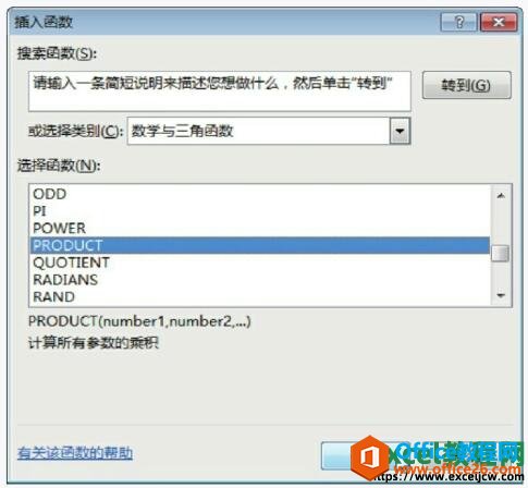 2、选择函数。打开“插入函数”对话框,在“或选择类别”列表中选择“数学与三角函数”,在“选择函数”区域选择PRODUCT函数,单击“确定”按钮,如图6所示。