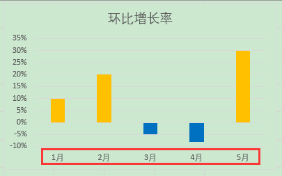 下图表格中A1:B6单元格区域为要制作图表的数据区域,其中“月份”为横坐标轴标签,“环比增长率”为图表数据系列。图片右侧为制作好的柱形图参考效果,图表中数据系列为正值的用橙色填充,为负值的用蓝色填充。