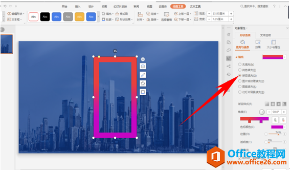插入后,单击设置对象格式,在填充处,选择渐变色填充,然后选择两个颜色。