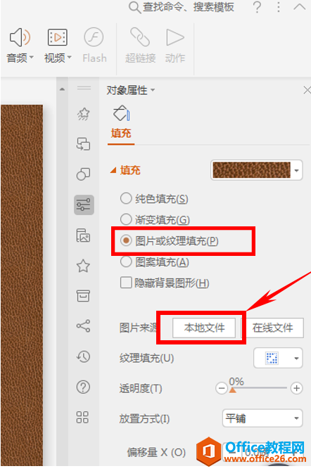 在右侧的工具栏中,填充方式选择【图片或纹理填充】,在图片来源处选择【本地文件】。