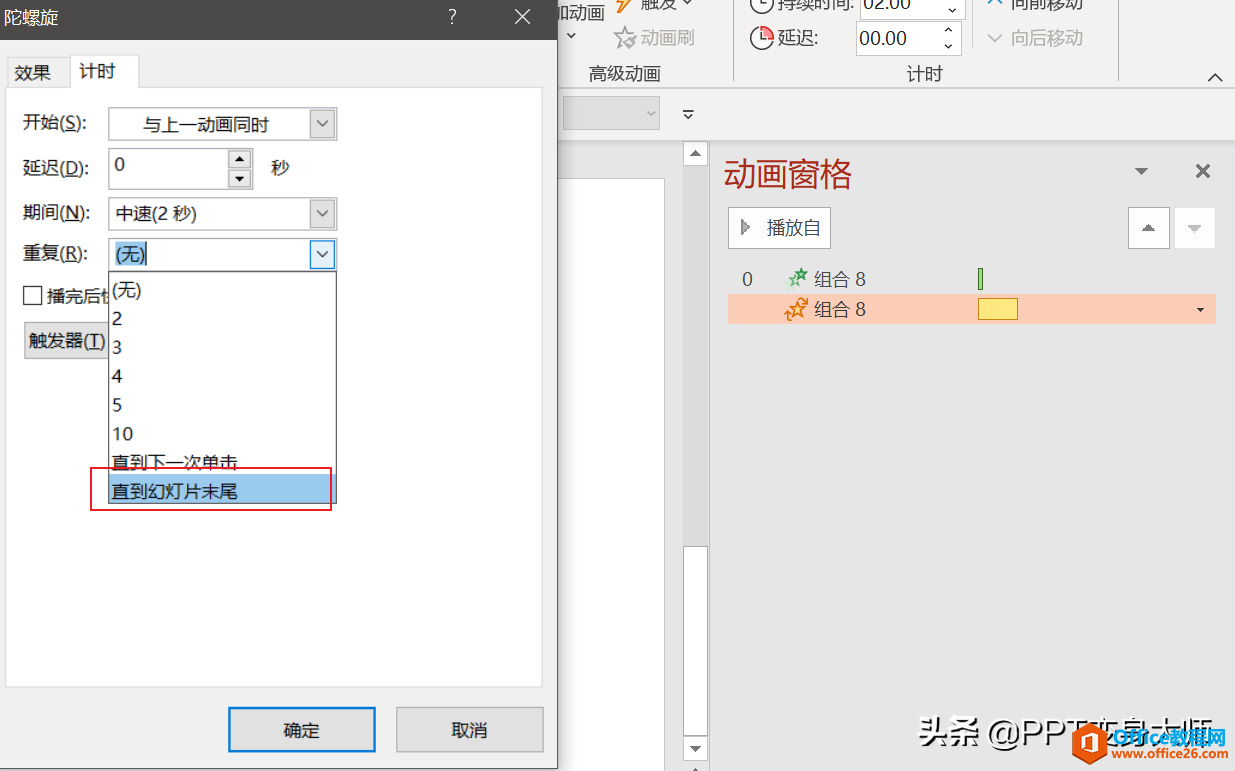 03)进入陀螺旋动画的效果选项,选择计时,重复中选择直到幻灯片末尾。