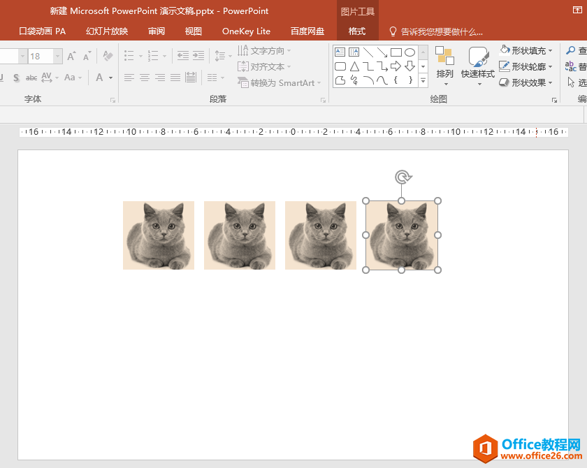 2、按两次F4键(如果是笔记本电脑可能要同时按Fn+F4),即可在第一排第二张小猫图片后面自动按相同的列间距复制出第三张和第四张小猫图片。