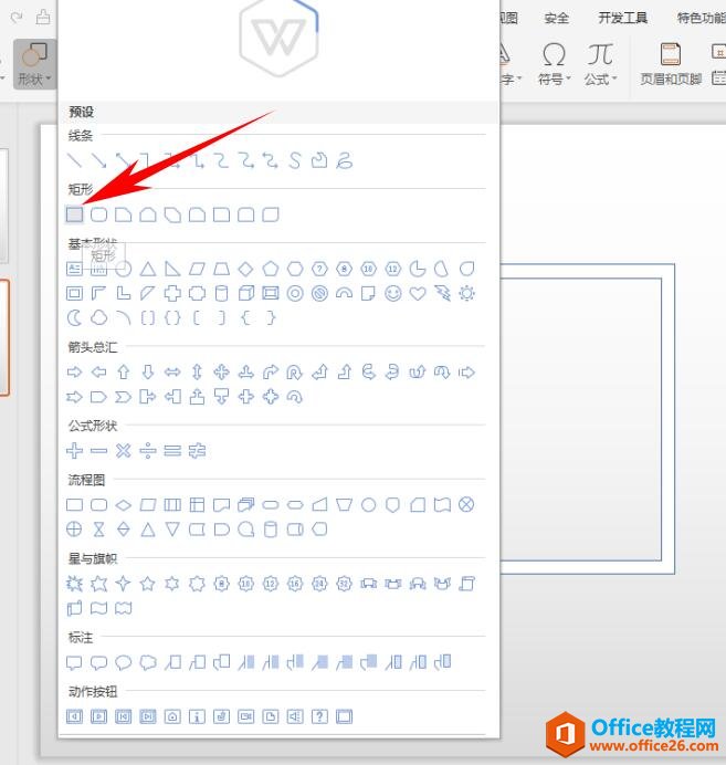 再次单击【插入】下的【形状】,在下拉菜单当中插入一个矩形,放置与线框重合位置: