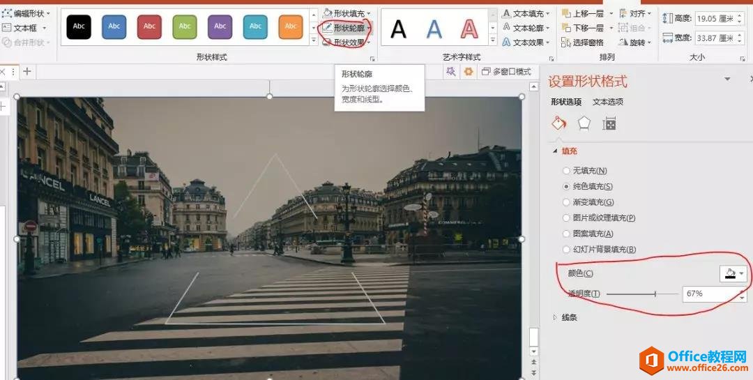 这里的蒙版就是插入一个形状,设置其填充颜色为黑色,透明度为67%。透明度可自己调整。把形状轮廓设置为无轮廓。
