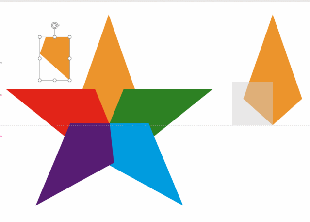 插入一个等腰三角形,细长一点,在按住ctrl键复制出来一个,拖曳旋转柄180,然后调整的短一点,最后利用组合功能将其组合成一个图形。 同样复制图形,进行旋转,注意旋转的时候,水平线,以及旋转点永远在五角星的整中心。