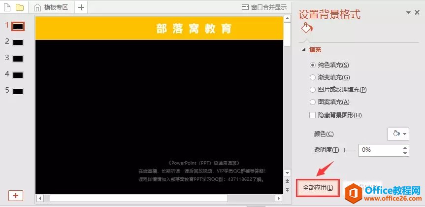 可以看到,只更改了当前页面背景,如果要将整个PPT的所有页面背景都更改为黑色,怎么办?很简单,一步就能实现。(3)只需点击”全部应用“按钮,即可看到左侧窗格中所有页面背景颜色已更改。