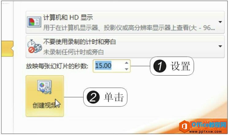 此时打开了创建视频选项面板,单击微调按钮,可以调整每张幻灯片放映的秒数,此时设置放映时间为“15.00”,单击“创建视频”按钮,如下图2所示。