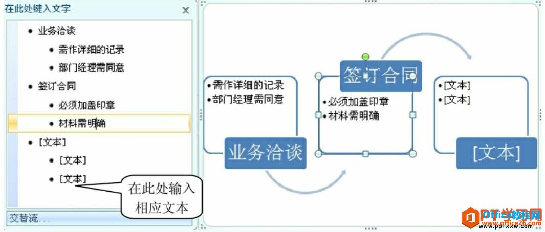 2、选择“流程”类别中的“交替流”图形,单击确定按钮,这样就在幻灯片中插入一个业务流程图模板,同时在流程图的左侧会显示一个名为“在此处键入文字”的文本窗格,在其中可以输入流程图中各个环节形状的标题以及相关说明文字。当然也可以直接在环节形状中直接输入相应的文字,而且也能够显示在这个文本窗格中,如图2所示。