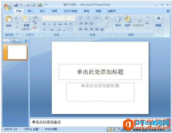 PPT应用程序启动后自动创建一个默认名为“演示文稿1”的空白演示文稿,并且带有一张“标题幻灯片”版式的空白幻灯片,如图1所示。