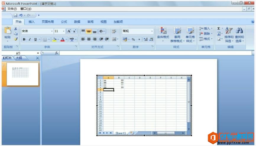 在这个工作区中(默认情况下这个区域比较小),我们完全可以像操作Excel一样来进行数据排序、计算等工作,操作完之后只需要在旁边空白的位置单击一下鼠标,一个美观的表格跃然纸上。PowerPoint表格的样式和颜色样式同样也可以应用到Excel工作区中。