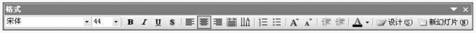 3、工具栏。工具栏位于菜单栏的下方。启动PowerPoint 2003时,自动显示“常用”工具栏(见图2)和“格式”工具栏(见图3),工具栏上的各按钮名称及功能如表1和表2所示。一般,工具栏中的命令是菜单栏中一些最常用的命令。使用工具栏中的按钮,可以快速完成各种常用的操作。