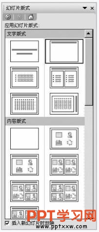 选择“格式”→“幻灯片版式”命令,打开“幻灯片版式”任务窗格,如图6所示。在该窗格中,预置的幻灯片版式以缩略图的形式显示。用户只需单击缩略图,即可将相应的版式应用于当前的幻灯片。使用这种方法,能够方便地为大量幻灯片设置各种不同的版式。