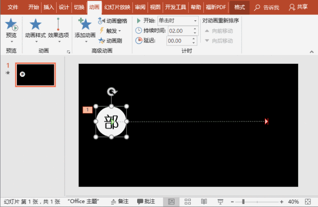 (4)设置动画。选中正圆形,点击【动画】-【高级动画】-【添加动画】按钮,在弹出的菜单中的“动作路径”栏中选择“直线”路径。然后调整末端路径到右侧的最后一个文字上。