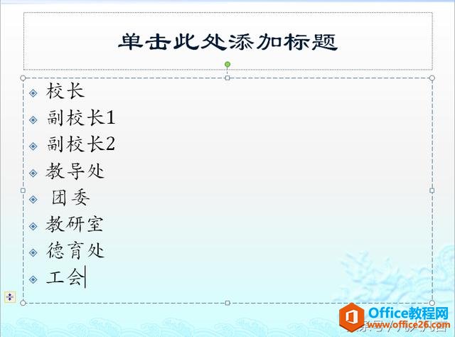 PPT版本以上有一个新的功能,叫SmartArt。SmartArt可以很方便的设计组织结构图。步骤:1.输入内容,如图所示2.选中除了校长以外的内容,点击【增大缩进级别按钮】3.点击【转换为SmartArt】......