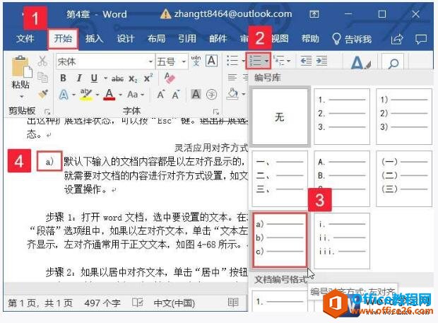 打开Word文档,将光标定位至需要设置编号的位置。切换至“开始”选项卡,在“段落”组内单击“编号”下拉按钮,然后在展开的编号库内选择合适的编号样式,即可将选中的编号应用至光标所在的位置前,效果如图2所示。
