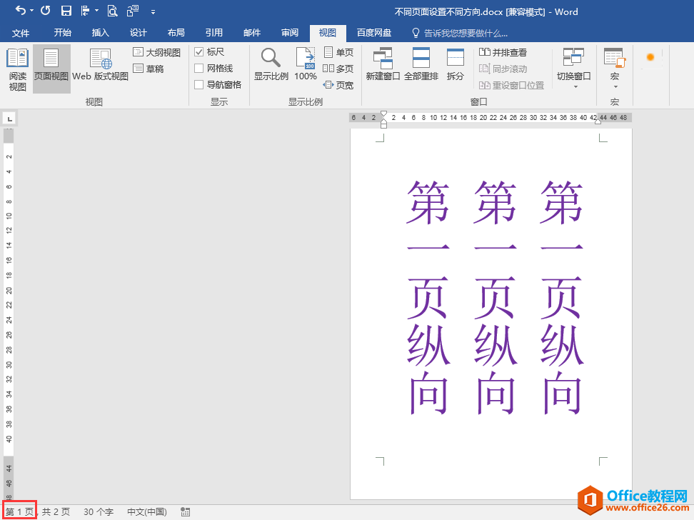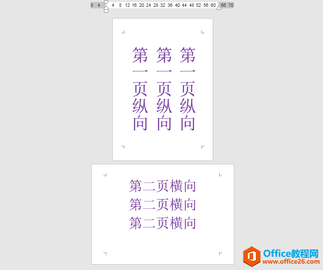 下图文档一共有两页,我们想将第一页的纸张方向设置为"纵向",第二页的纸张方向设置为"横向"。