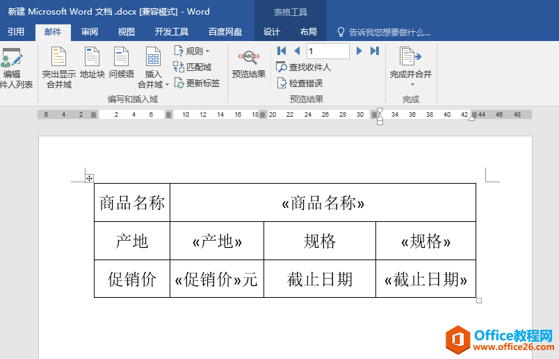 按照同样的办法依次在其他空白单元格中插入"产地""规格""促销价""截止日期"合并域。