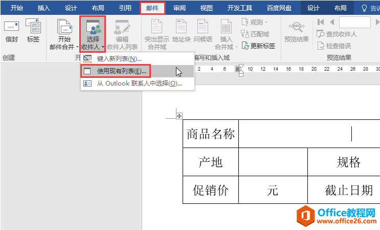 5.执行"邮件"-"选择收件人"-"使用现有列表"命令,在打开的"选取数据源"对话框中,找到存放标签数据信息的工作簿"标签资料",单击选中,再单击对话框下方的"打开"按钮。