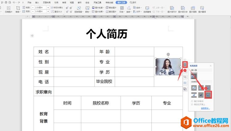 我们看到图片太小,点击图片旁边的第一个选项,将“嵌入型”更改为“上浮型”: