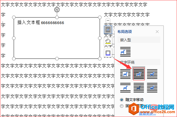 1、在文本框的右侧,点击“布局选项”,在弹出的选项列表中按需要选择需要的文本框文字环绕类型。