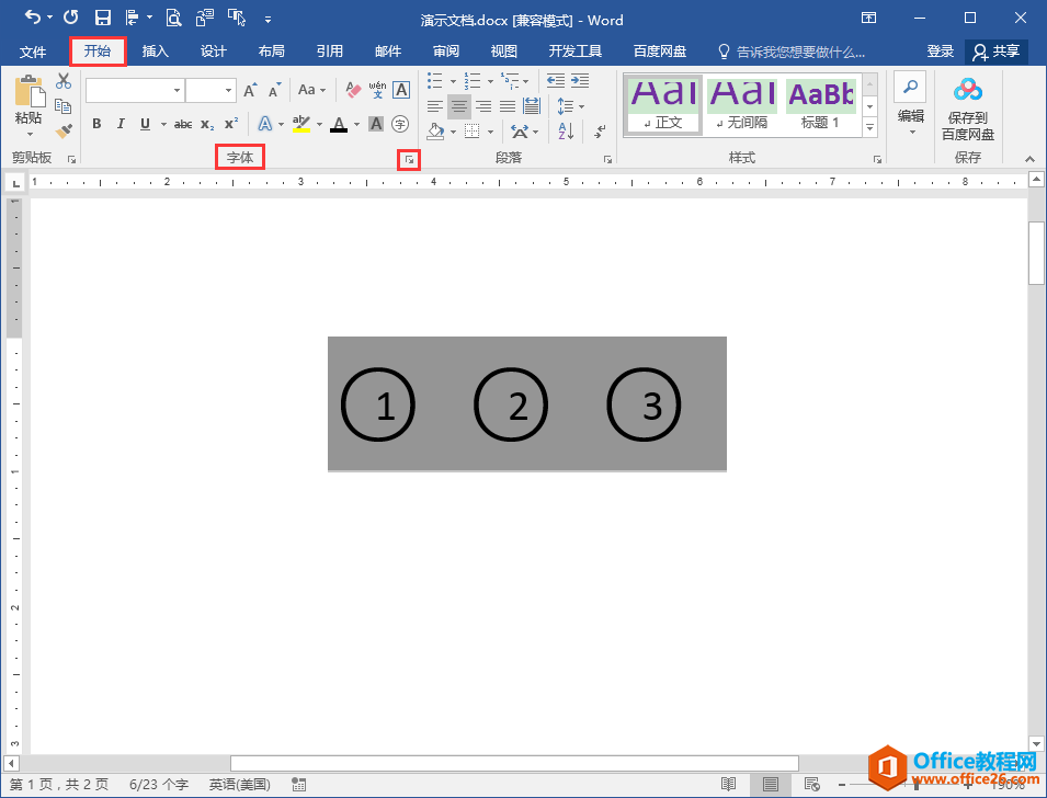 1. 选中带圈字符,在“开始”选项卡“字体”功能组中单击右下角的对话框启动器按钮。