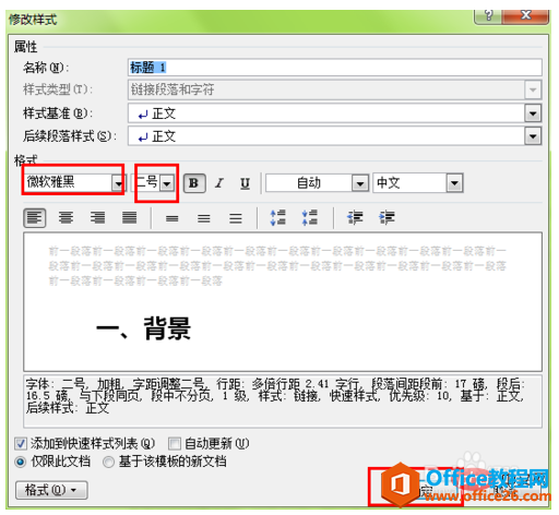 完成上步操作之后,就该应用刚才设置的样式了。在应用样式前,首先你要明白哪些是属于一级序列的,哪些是属于二级序列的,这需要自己判断,小编就不多说了。以小编找的一篇文章为例,首先选中一级序列的标题“一、背景”→点击刚才设置的“标题1”(如图5),就可以看到你选中的地方变成你刚才设置的字体和字号,并且前面有个小黑点,表示已经设置成功。
