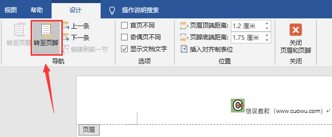 单击“转至页脚”按钮,可切换至页脚,并对页脚进行设置。
