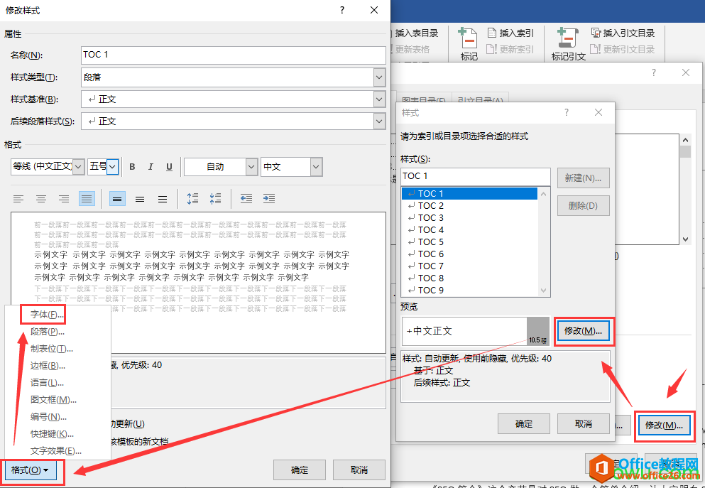 打开“修改样式”对话框,用户可以简单的设置目录的字体格式,如果需要更详细地设置,需要单击“格式”按钮,从展开的列表中选择“字体”选项。