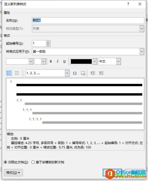 打开“定义新列表样式”对话框,在“名称”文本框中为新列表命名。在“格式”选项区域中,用户可对编号级别、编号格式进行相应的设置,然后点击“确定”按钮。