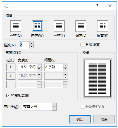 技巧提示:如果选择“更多栏”选项,将会打开“栏”对话框,可以根据需要设置文档分栏数、分栏宽度、分隔线,以及应用于整篇文档或当前节设置分栏。