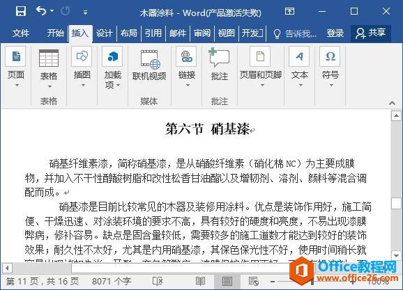 在Word中,常用超链接方法有两种:一是文档内部的超链接,二是,文档外部的超链接。下面分别进行介绍。 一、文档内部的超链接文档内部的超链接最常见于文档目录。将目录与内容进行链接,用户就能很方便地跳转到文档中的相应位置处,快速查看内容。下面以链接文档目录“第六节,硝基漆”及其文档中对应内容为例,方法如下: 1、选中需要链接的对象,点击 “插入—链接—书签”。