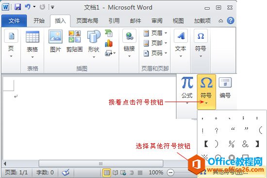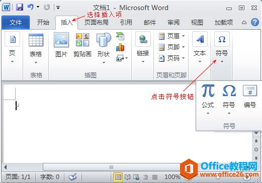 步骤一、无论是Word2003到现在Word2010,插入的步骤都大同小异,今天就以Word2010为例来说明吧。首先打开Word2010,找到【菜单栏】的【插入】项,点击插入项的【符号】按钮。如图所示: